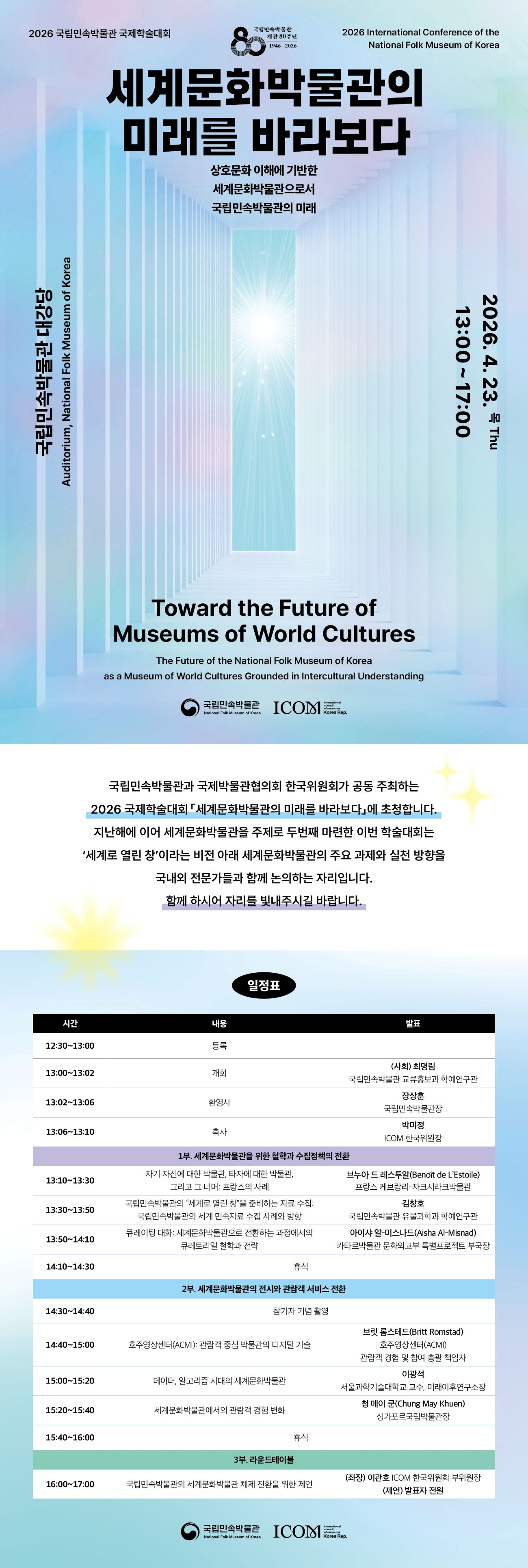 - 대회명: 2026 국립민속박물관 국제학술대회 <세계문화박물관의 미래를 바라보다: 상호문화 이해에 기반한 세계문화박물관으로서 국립민속박물관의 미래>