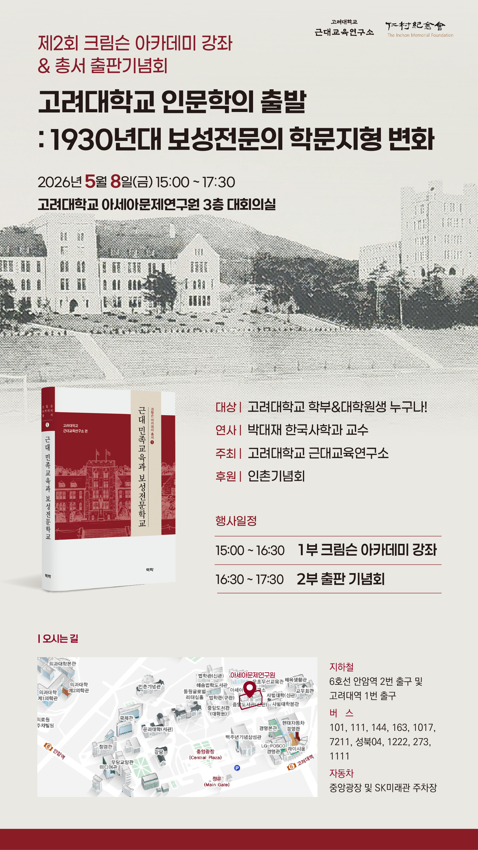 고려대학교 근대교육연구소는 제2회 크림슨 아카데미 강좌로 박대재 교수님을 모시고 "고려대학교 인문학의 출발"을 주제로 특강을 마련하였습니다.